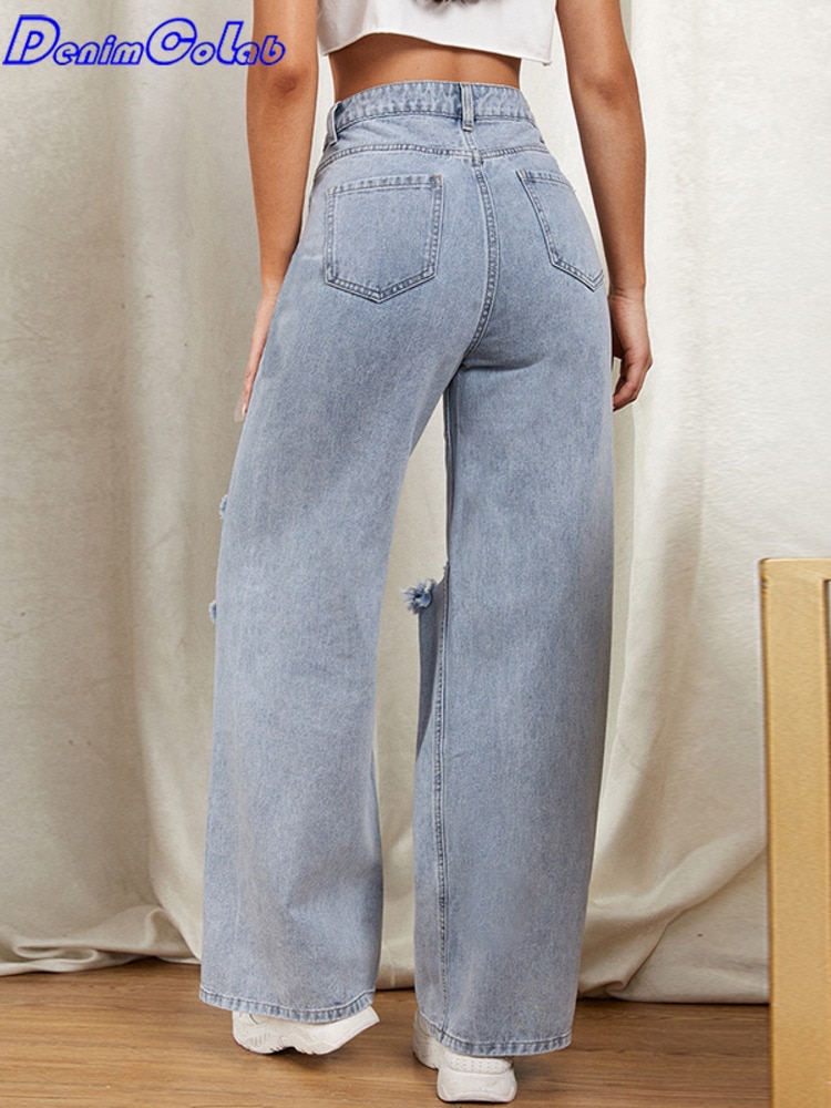 DenimColab 2023 Hole Washed Wide Leg Pants Jeans Women Loose Boyfriend Jeans 100% Cotton Mom Jeans Casual Trousers Denim Pants
