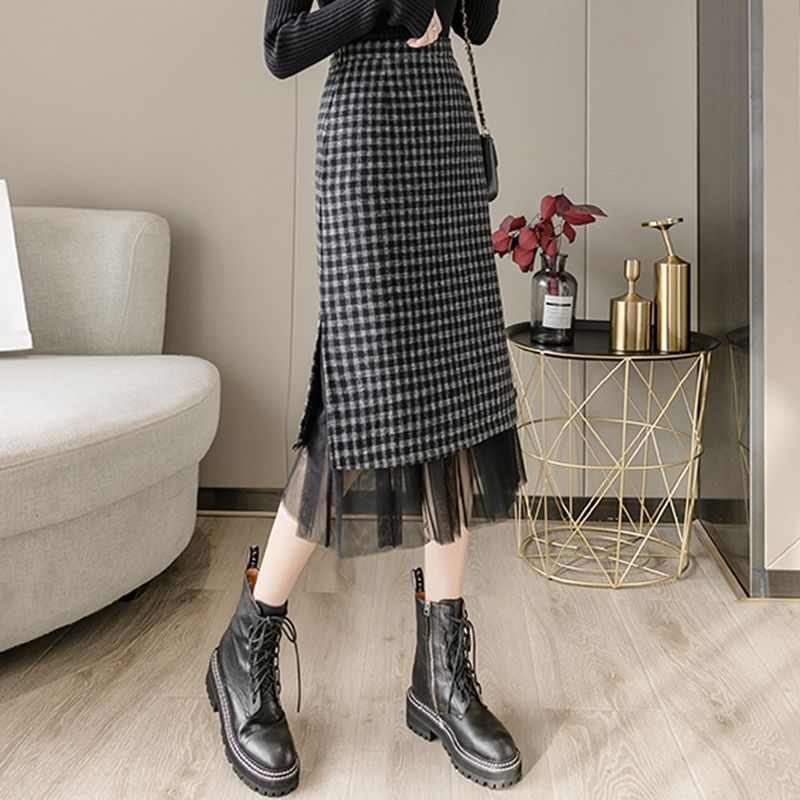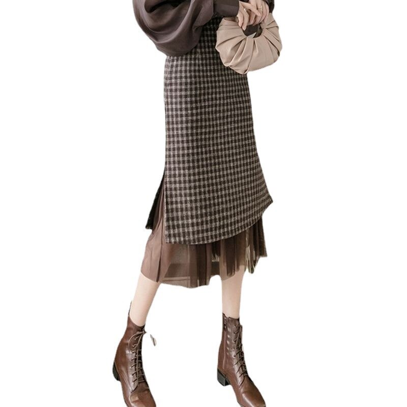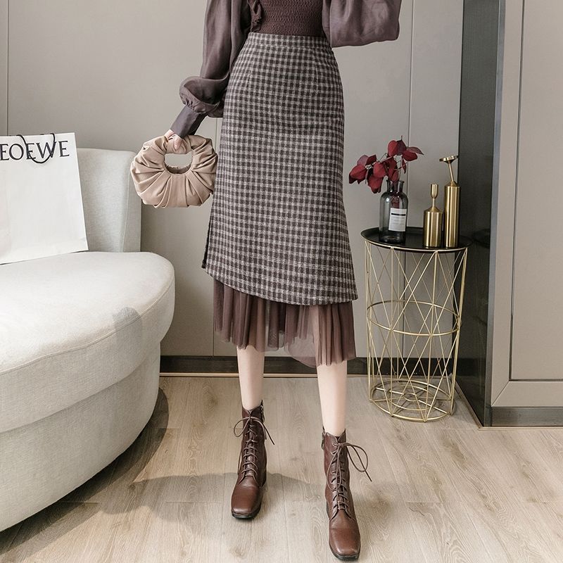 Woolen half length skirt for women in autumn and winter 2022, new plaid, westernized, small, a figure, hip wrap, medium length s