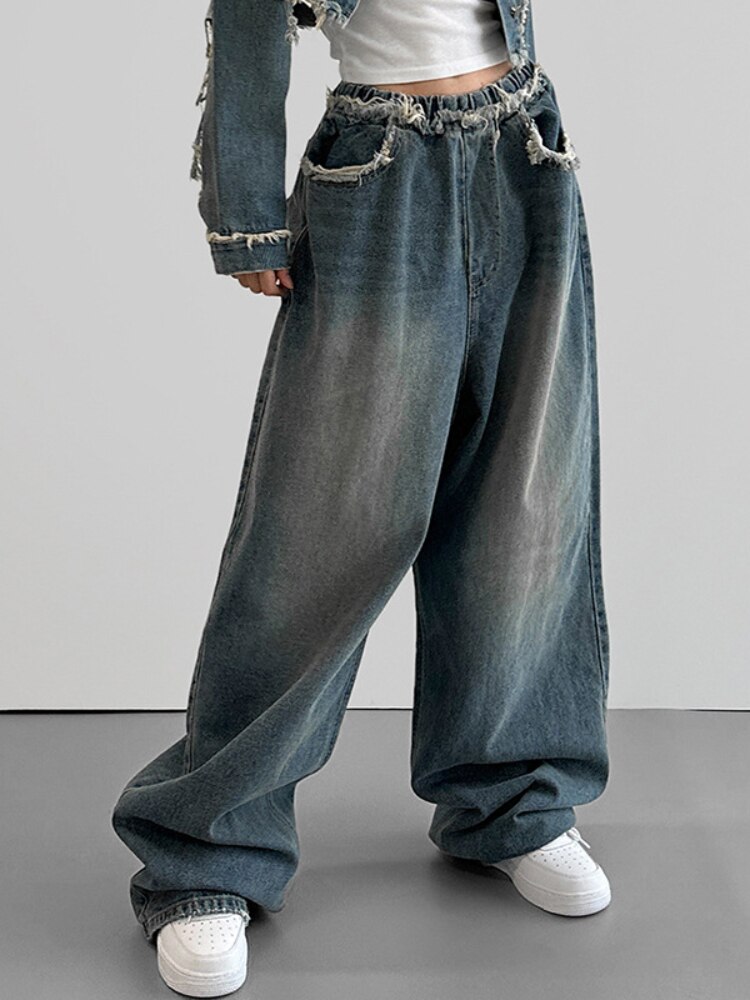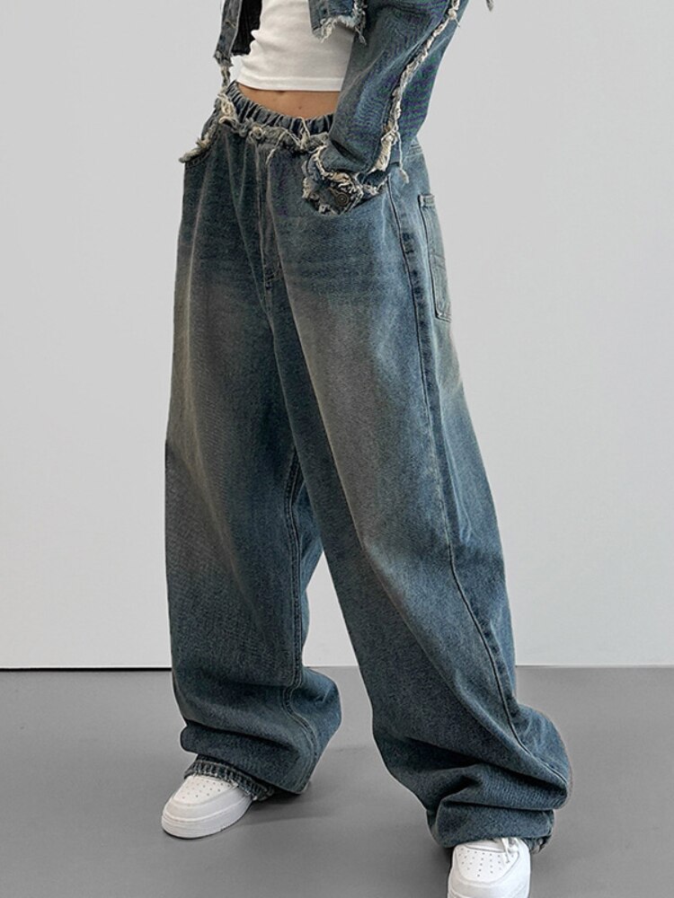 WeiYao Raw Edge Baggy Pants High Waisted Washed Wide Leg Jeans Vintage 90s Korean Fashion Streetwear y2k Women's Jeans Joggers
