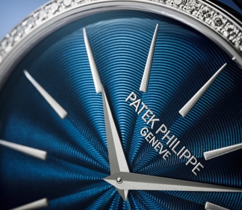 This women's Calatrava timepiece features an engraved lacquered dial with a slightly enlarged case diameter (35 mm diameter) and is equipped with a self-winding movement that replaces the original manual movement. The dial is decorated with a delicate concentric ripple pattern, and the dial base panel is coated with multiple layers of transparent varnish to reveal a delicate and deep midnight blue light. The bezel is decorated with 76 round-cut flawless Wesselton diamonds. The new watch features a satin-brushed calfskin strap with a shimmering navy blue that echoes the colour of the dial.