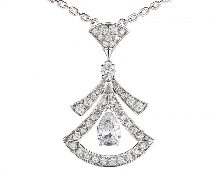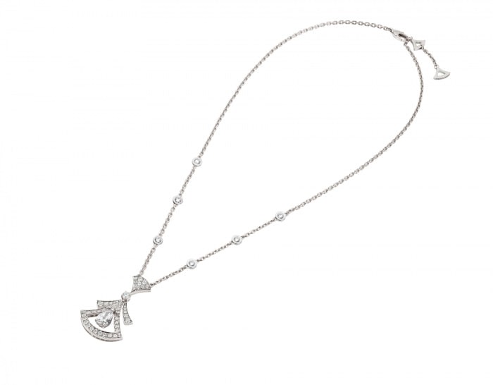 The DIVAS' DREAM necklace captures the essence of Italian aesthetics and elegance, paying homage to the enchanting goddess in the unique Roman spirit. THE GLAMOROUS AND DELICATE JEWELRY IS FAN-SHAPED INSPIRED BY THE MOSAIC DECORATIONS OF ROMAN'S CARACALLA BATHS, AND REINTERPRETED WITH LIGHT OPENWORK ELEMENTS AND BRILLIANT DIAMONDS.