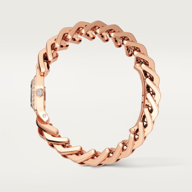 MAILLON DE CARTIER watch, quartz movement. 750‰ rose gold case and crown, set with 25 brilliant-cut round diamonds, totaling 0.61 carats. Dimensions: 31mm X 17mm. Thickness: 6.8mm. Silver-plated sunray effect dial, sword-shaped blue steel hands, 750‰ rose gold bracelet. Water-resistant to 3 bar (approximately 30 meters).