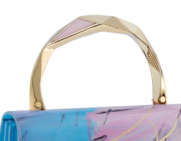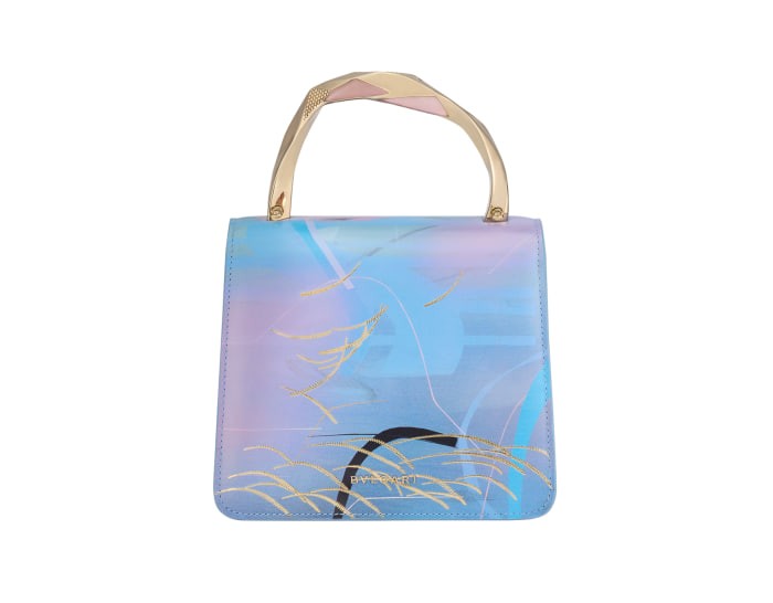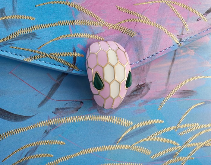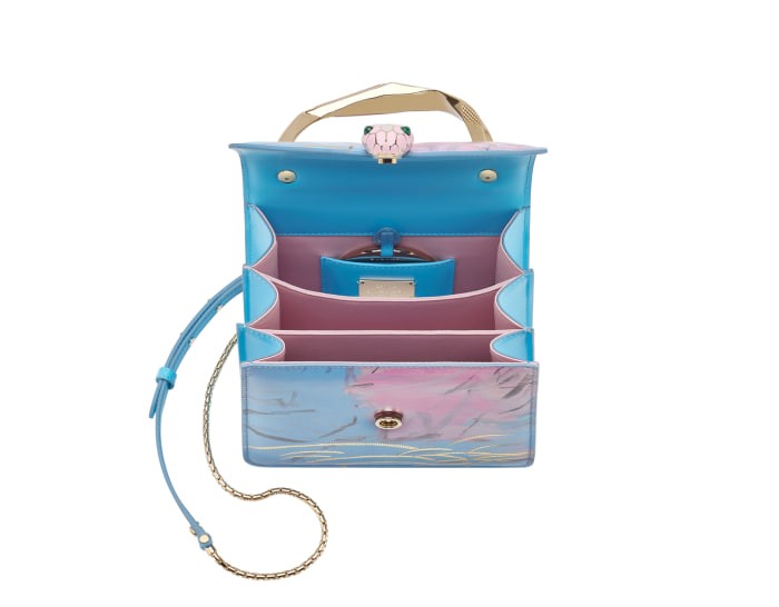 The SERPENTI FOREVER OCEAN limited edition small handbag comes from the SERPENTI IN ART capsule series jointly created by BULGARI and contemporary artist Zhou Li, showing its creative style. The body of the bag is exquisitely made of ocean blue calfskin, decorated with gold embroidery, and matched with SPLISH SPLASH light blue calfskin sides, vividly depicting a secret dream-like mood and praising mankind's unremitting pursuit of freedom and hope. At the same time, artist Zhou Li reinterprets the light gold-plated brass handle with geometric shapes that complement the golden mirror finish and pink quartz inlay. The work is paired with a snake-shaped chain and leather shoulder strap, decorated with the iconic snake head magnetic clasp. Its charming design and scales draw inspiration from the SERPENTI series of jewelry from the 1960s. It has three compartments, a mirror pocket with a customizable vanity mirror and an inner metal nameplate engraved with "ZHOU LI X BULGARI", with the BULGARI metal logo on the back. 18.5 X 15 X 10.5 cm - 7.3 X 5.9 X 4.1 inches. made in Italy.
