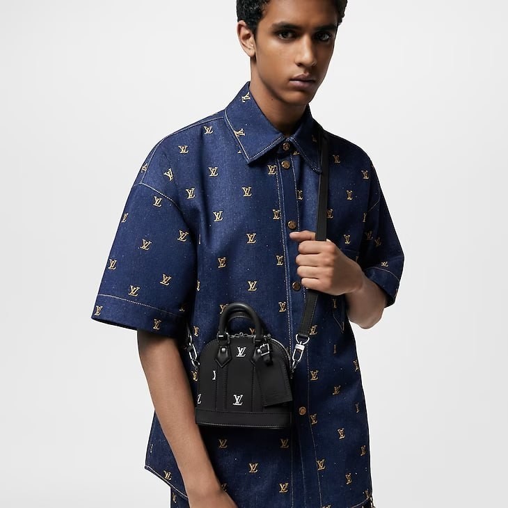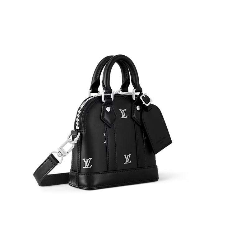 Nano Alma bag was designed by Creative Director Pharrell Williams from LV Blason patterned calf leather. This is a new motif transformed from silver LV logos embossed and printed on a smooth leather background. Similar to products in the Alma bag line, this petite version has a distinctive bag shape, along with a name tag and rolled leather handle.
